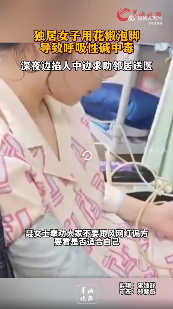 近日,广东广州,一独居女生深夜在家用花椒煮水泡脚,泡后10分钟开始呼吸困难,边掐人中边跑出门喊救命,热心邻居紧急送医,医生诊断为呼吸性碱中毒。