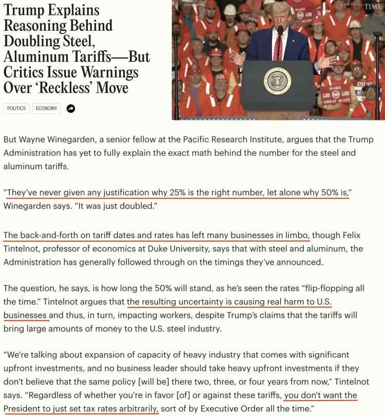 “他们(美国政府)从未解释过之前的25%为什么是合理税率,更不用说现在的50%了。税率就这么随随便便翻了一倍。”