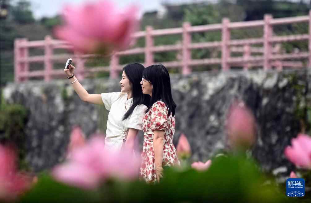 6月4日,在广西三江侗族自治县良口乡和里村,两名游客在荷花池旁游玩拍照。