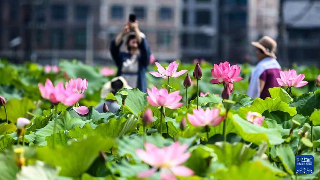 6月4日,广西三江侗族自治县良口乡和里村上百亩荷花盛放,吸引游客前来观赏。