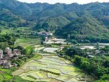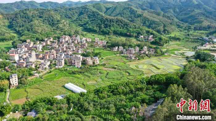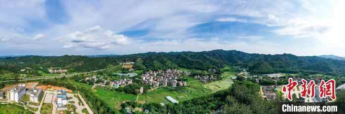 6月3日,航拍广西梧州市长洲区倒水镇富万村,色彩斑斓的田园与房屋、道路、山峦及蓝天白云交相辉映,描绘出一幅美丽的生态乡村画卷。黎杰源 摄