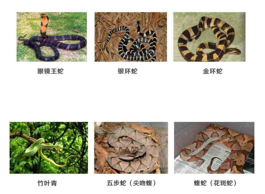 银环蛇、金环蛇、眼镜王蛇、眼镜蛇、五步蛇、蝮蛇、蝰蛇、竹叶青蛇、烙铁头、青环海蛇。