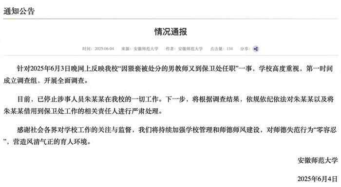 6月4日,安徽师范大学发布情况通报称,针对6月3日晚网上反映该校“因猥亵被处分的男教师又到保卫处任职”一事,学校高度重视,第一时间成立调查组,开展全面调查。目前,已停止涉事人员朱某某在该校的一切工作。下一步,将根据调查结果,依规依纪依法对朱某某以及将朱某某借用到保卫处工作的相关责任人进行严肃处理。