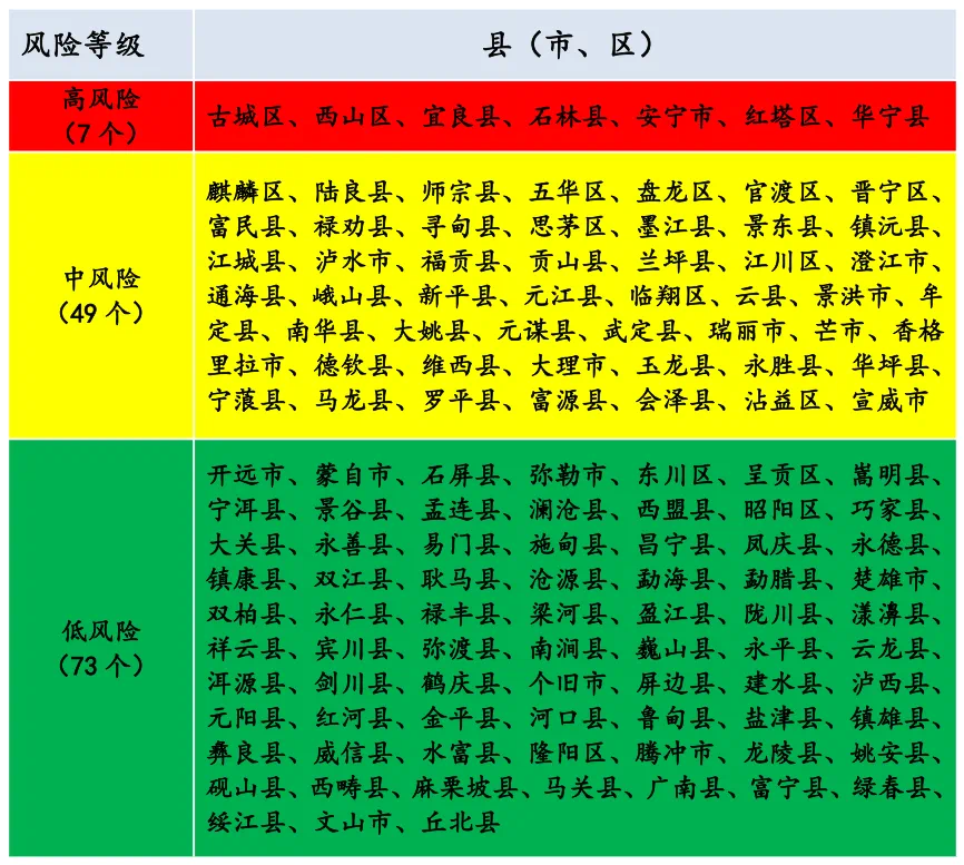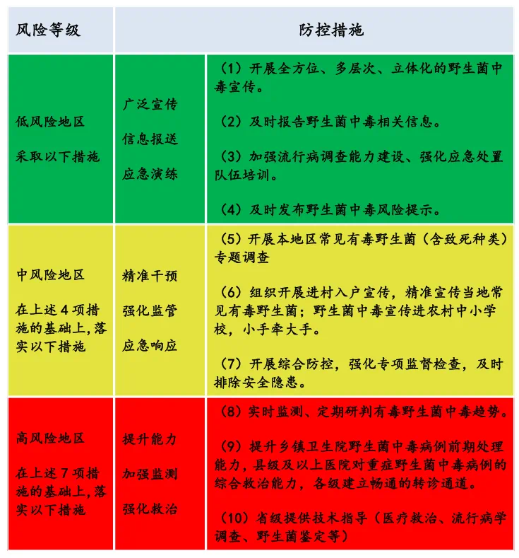 2025年,云南省在野生菌中毒防控工作中创新风险分级机制,在既往中毒事件监测数据基础上,新增居民野生菌中毒知识知晓情况和医疗救治能力两大核心指标,科学构建动态分级管理体系。全省共划定野生菌中毒高风险地区7个,中风险地区49个,低风险地区73个。其中丽江古城区,昆明西山区、宜良县、石林县、安宁市,玉溪红塔区、华宁县7个县(市、区)为高风险地区,以上地区需切实提高居民野生菌中毒防范意识,增强自我保护能力,有效预防中毒事件发生,全力保障人民群众生命财产安全。
