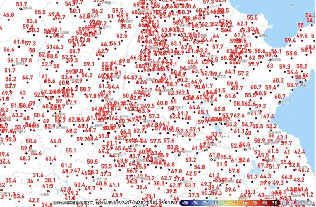 北方的炎热属于典型的干热,光照足、湿度低,猛烈的阳光照射地面使得地表温度升高尤为明显,真有点“炙烤”的感觉。今天12至13时,河北中南部、山西南部、河南北部、山东西部等地地表温度都超过了60℃。