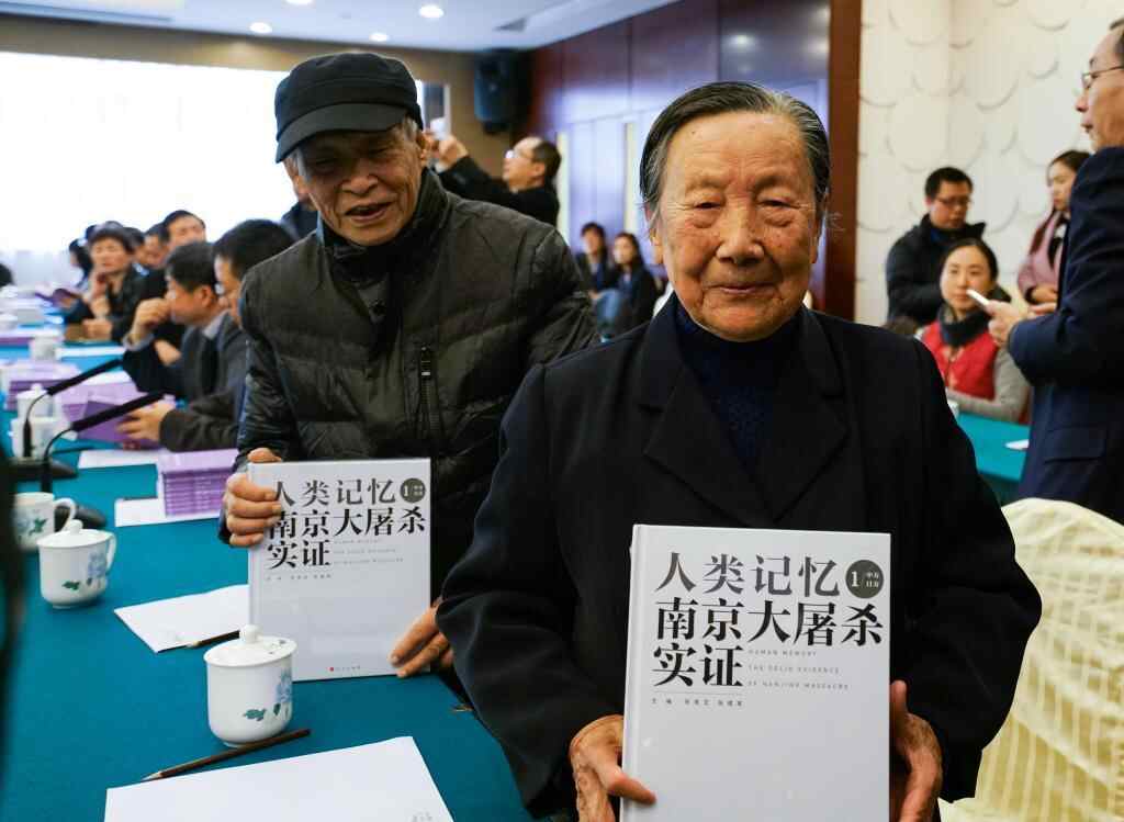 ↑2016年12月12日,在南京举行的“以史为鉴、警示未来”2016年系列图书首发式上,夏淑琴(前)展示获赠图书。