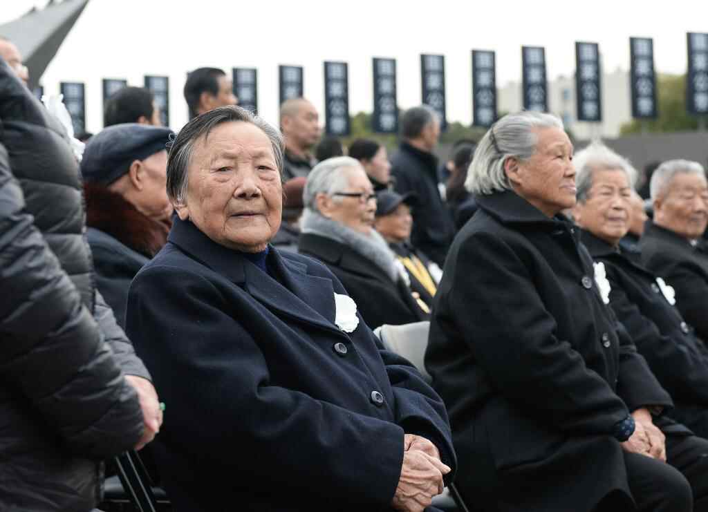 ↑2017年12月13日,夏淑琴(左一)在南京大屠杀死难者国家公祭仪式现场。