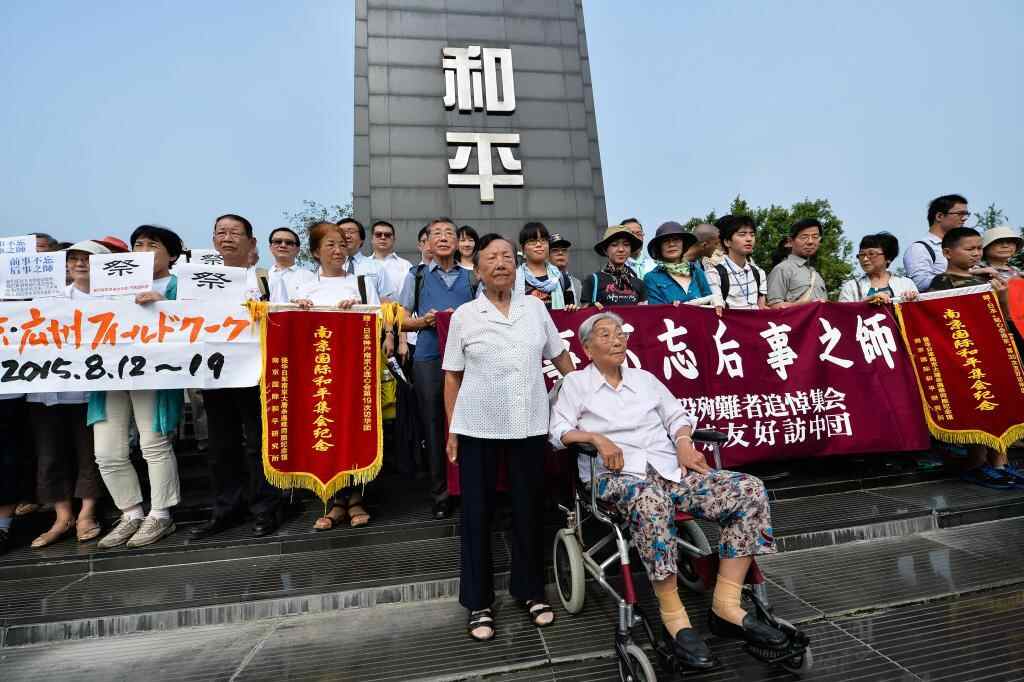 ↑2015年8月15日,在侵华日军南京大屠杀遇难同胞纪念馆和平公园举行的国际和平集会上,南京大屠杀幸存者代表夏淑琴(前左)、陈桂香(前右)和日本友好团体成员合影。