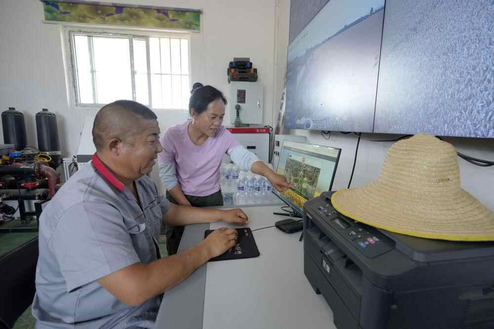 在山西省运城市盐湖区解州镇曲村,董会龙(左)和妻子范月亲通过农机精准作业平台查看农机手作业情况。董会龙夫妻是运城市盐湖区解州镇的种粮大户。(5月27日摄)。