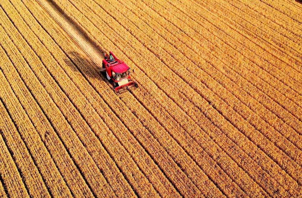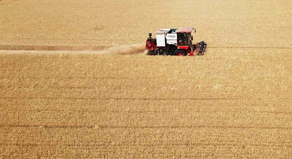麦田金黄,农机手收割正酣,一排排小麦被整齐地切割、脱粒……广袤农田一片繁忙景象。