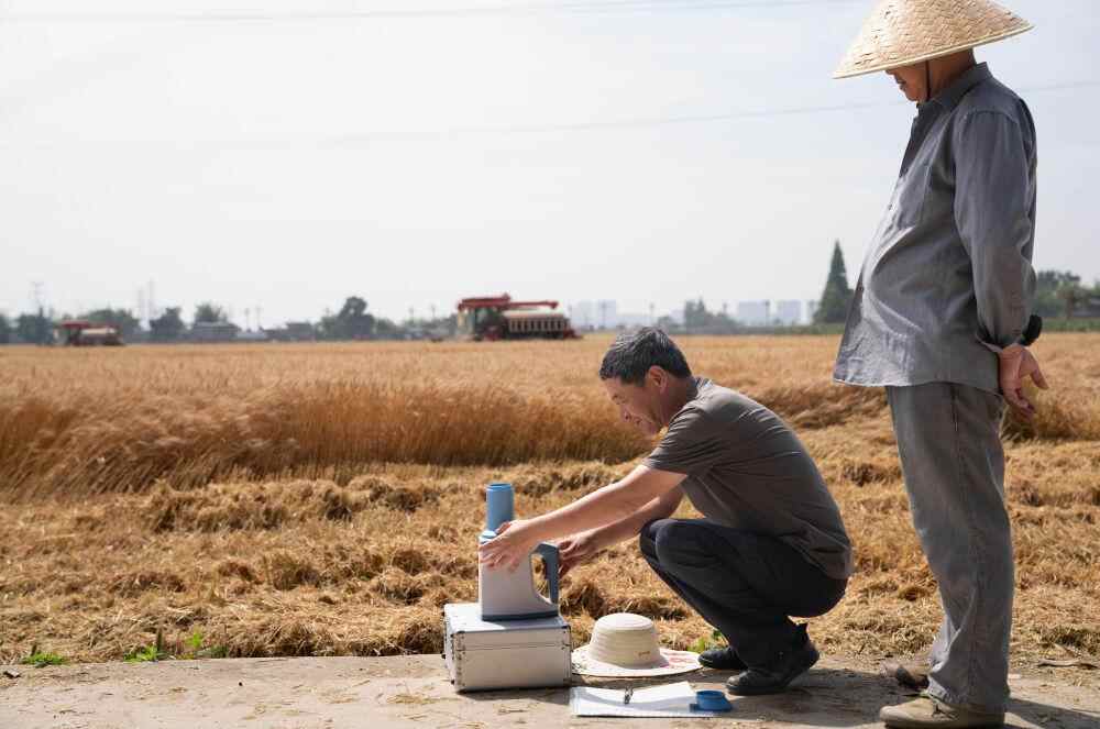 5月15日,工作人员在四川广汉市南丰镇双福村测量刚收获小麦的水分。