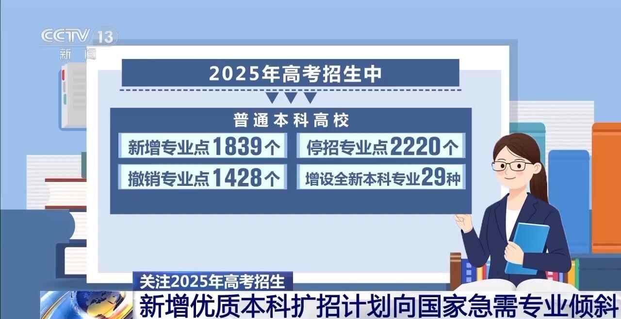 据初步统计,今年高考招生中,“双一流”高校本科扩招人数已超2万人。不仅增加优质学位供给,高校专业布点也进行了优化调整。2025年高考招生中,普通本科高校共新增专业点1839个,停招专业点2220个,撤销专业点1428个,增设全新本科专业29种。教育部还首次建立了战略急需专业超常设置机制,开辟即时响应“绿色通道”,指导北京航空航天大学、北京理工大学、北京邮电大学等6所高校设置了低空技术与工程专业。
