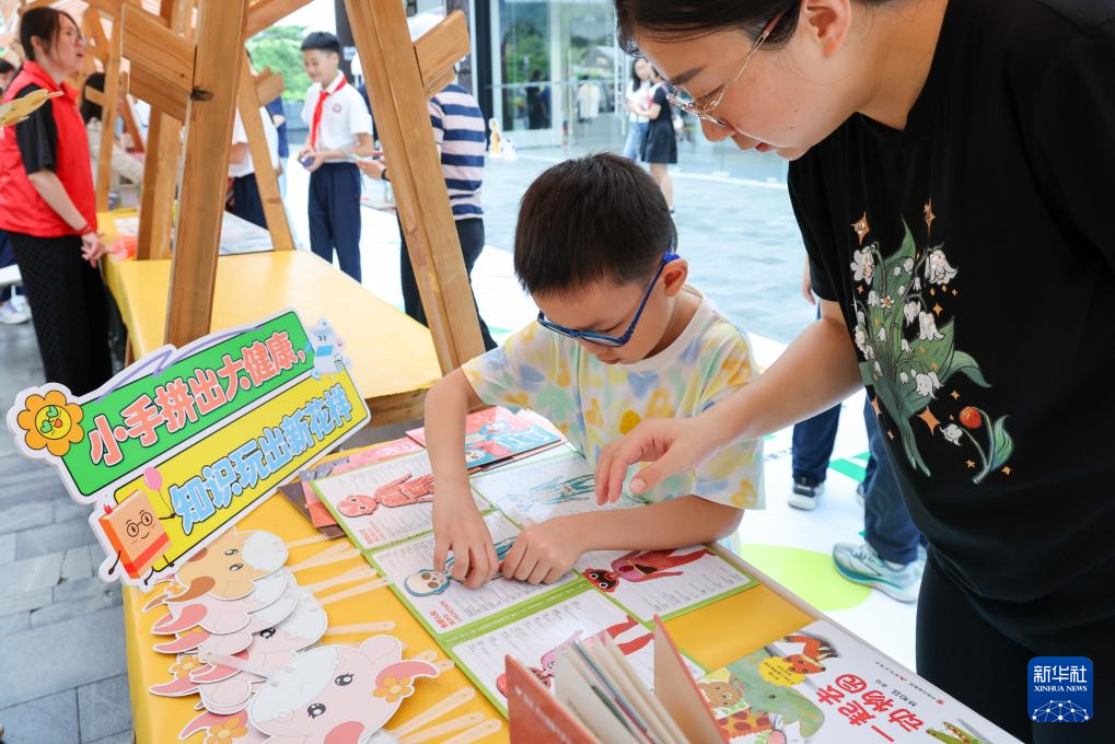 5月30日,在深圳深业上城莲花山幸福长廊,孩子和家长在“祝福孩子”主题游园会活动中参与儿童健康互动游戏。