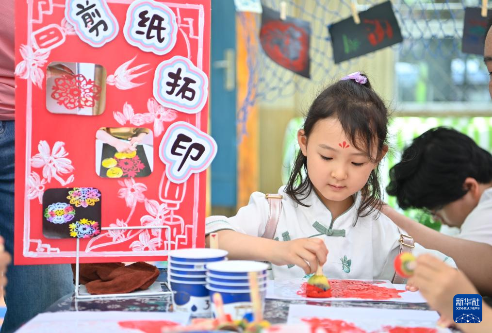 5月30日,山西省太原市迎泽区师苑幼儿园的小朋友在庆祝“六一”主题活动中体验剪纸拓印。