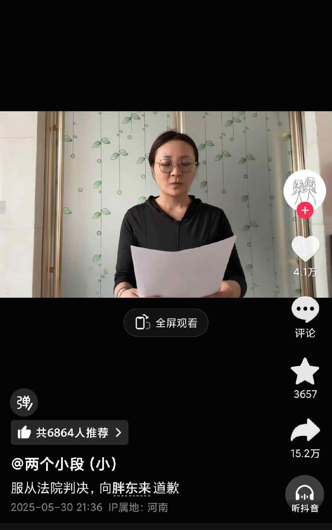 5月30日,段某(网名“两个小段(小)”)通过其抖音账号发布道歉视频,面对镜头鞠躬:“真诚地向胖东来道歉”,承认此前未充分核实商品质量问题,表示“愿意服从法院的判决”。