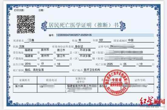 朱某林亲戚给记者提供的《居民死亡医学证明(推断)书》显示,小鑫死亡原因为“脑疝,高处坠落”。除需要医院出具相关死亡证明外,孩子火化时,也需警方盖章确认。记者注意到,杭州市公安局上城区分局四季青派出所也在载明死亡原因为“脑疝,高处坠落”的相关证明书上,盖了红章确认。