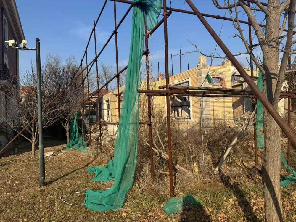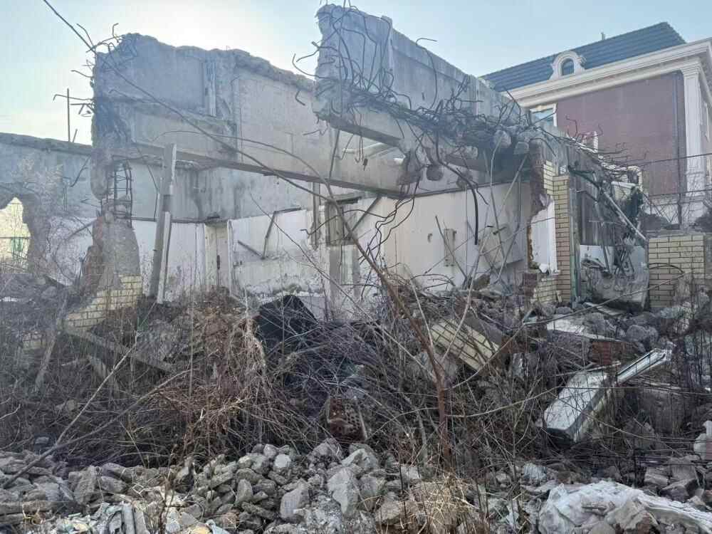 照片显示,这栋别墅的周围搭起钢架,地面部分只剩几面墙,且部分墙体的钢筋裸露在外,地面散落着碎石,房屋结构已不完整。