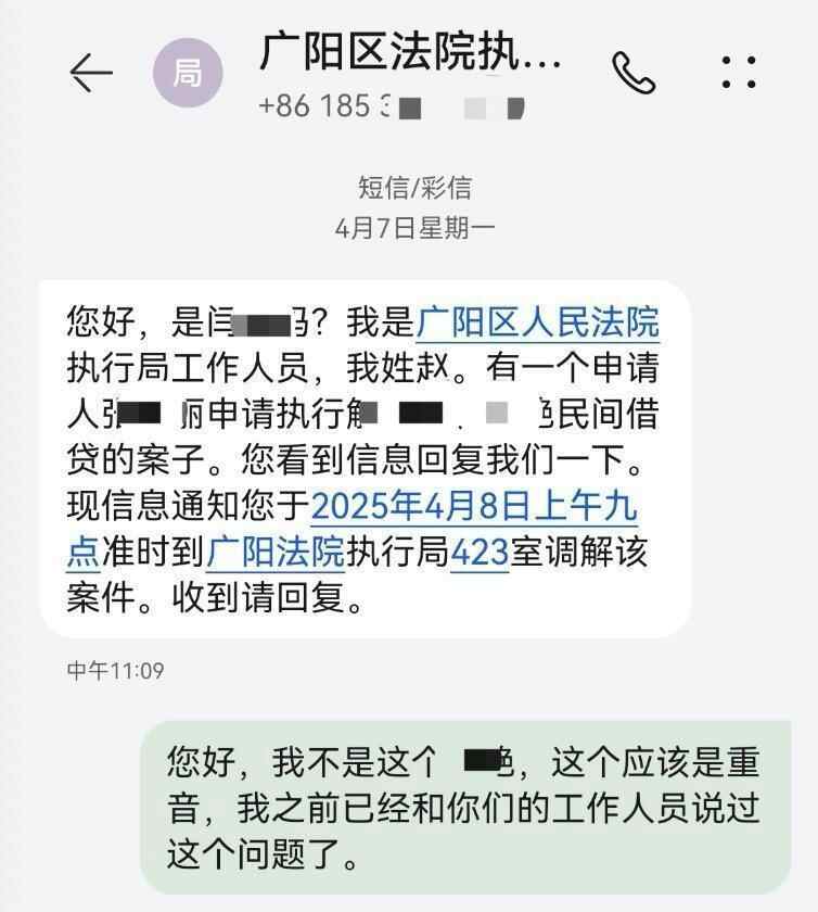 2025年4月,事件进一步恶化。4月7日,广阳区人民法院执行局赵姓工作人员短信通知颜女士参与调解,颜女士第一时间回复信息并电话联系,证明自己并非该案被执行人,工作人核实信息并确认,表示以后不会再打扰。到了23日,两名执行局工作人员携带民事判决书至颜女士工作单位,通过办公室人事科联系其领导核查身份,领导明确告知被执行人非颜女士本人。