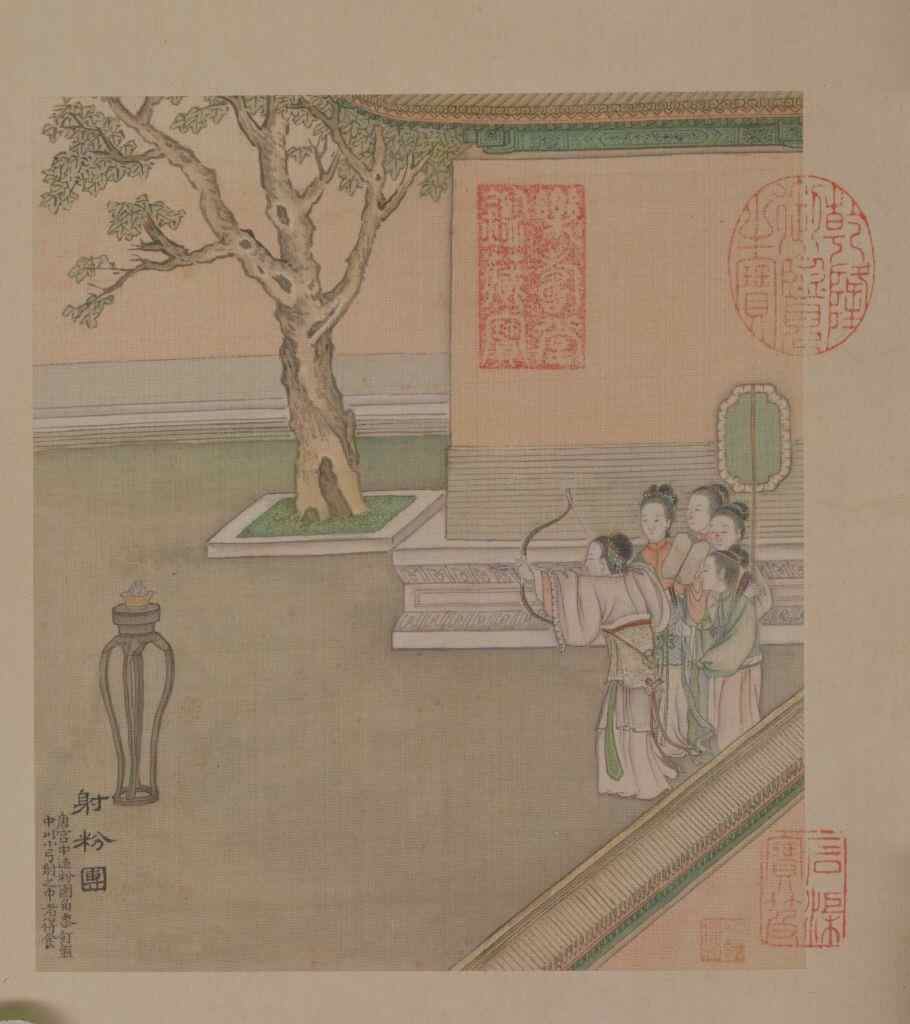 △《射粉团》,题:“唐宫中造粉团角黍饤盘中,以小弓射之,中者得食。”