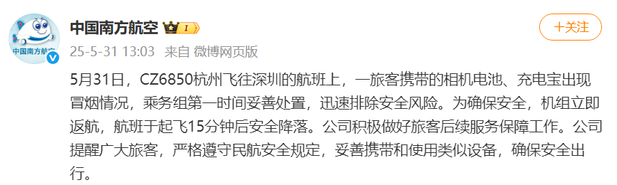 @中国南方航空 消息:5月31日,CZ6850杭州飞往深圳的航班上,一旅客携带的相机电池、充电宝出现冒烟情况,乘务组第一时间妥善处置,迅速排除安全风险。为确保安全,机组立即返航,航班于起飞15分钟后安全降落。公司积极做好旅客后续服务保障工作。公司提醒广大旅客,严格遵守民航安全规定,妥善携带和使用类似设备,确保安全出行。