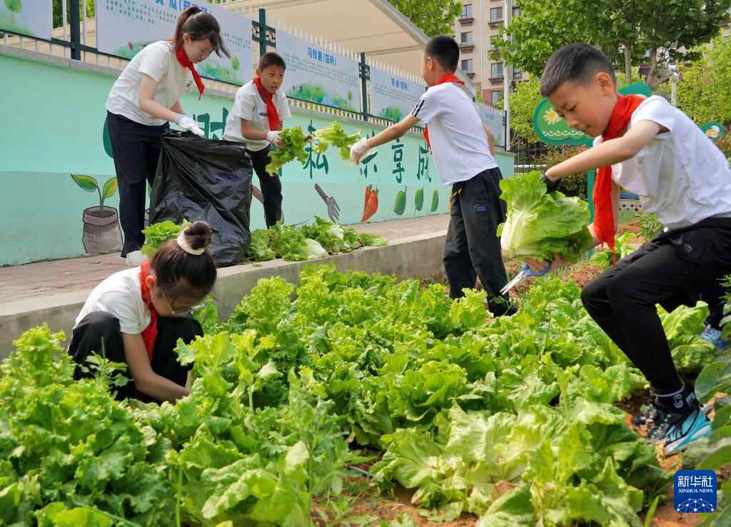 5月29日,在山东省烟台市康和小学迎“六一”劳动实践比赛上,孩子们在收获自己种植的生菜。