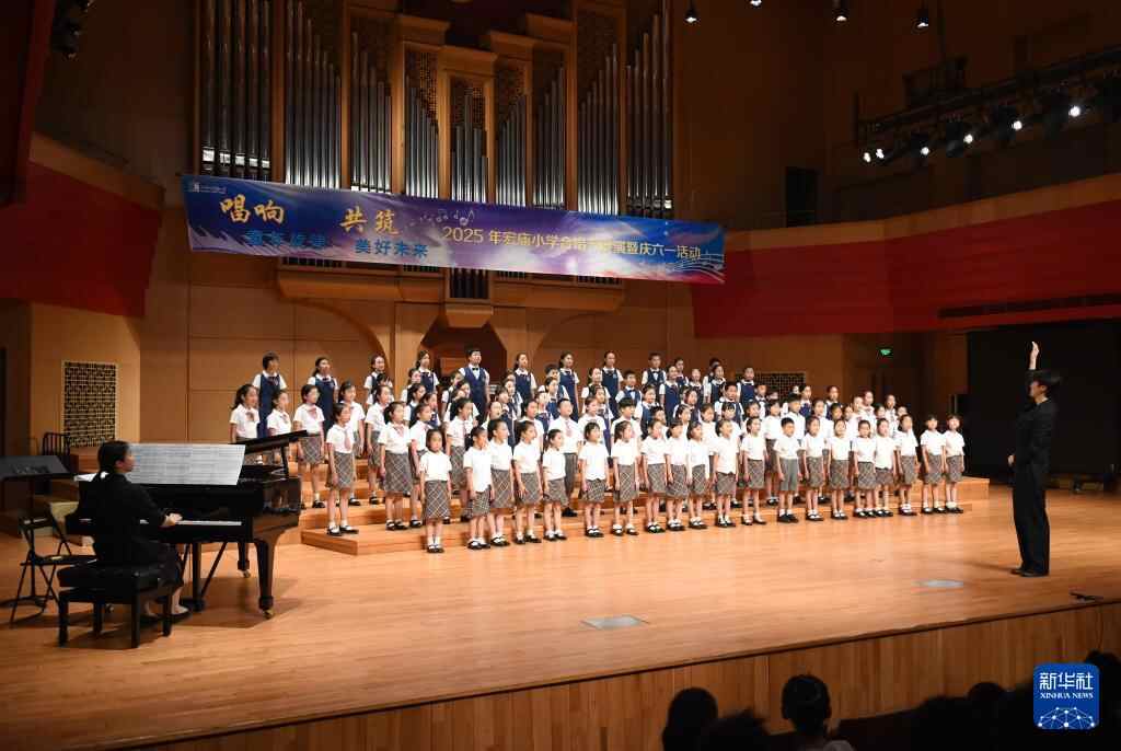 5月29日,北京市西城区宏庙小学学生在2025年宏庙小学合唱节展演暨庆六一活动中演唱歌曲。