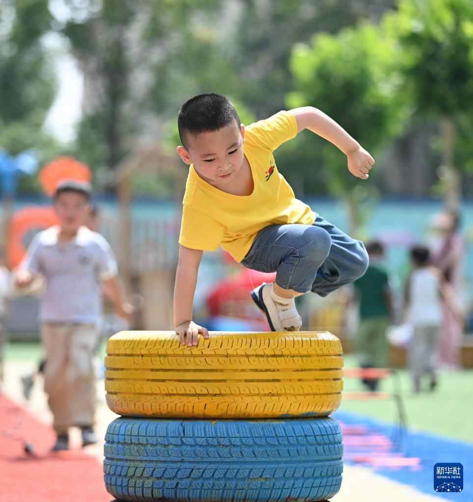 5月29日,在山东省滕州市西岗镇中心幼儿园,小朋友们参加“跳轮胎”趣味运动。