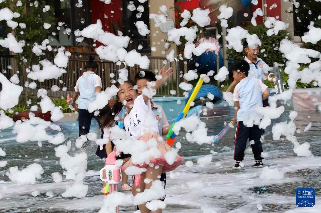5月28日,在山东省滨州市博兴县第二实验幼儿园,小朋友在水池中玩耍。
