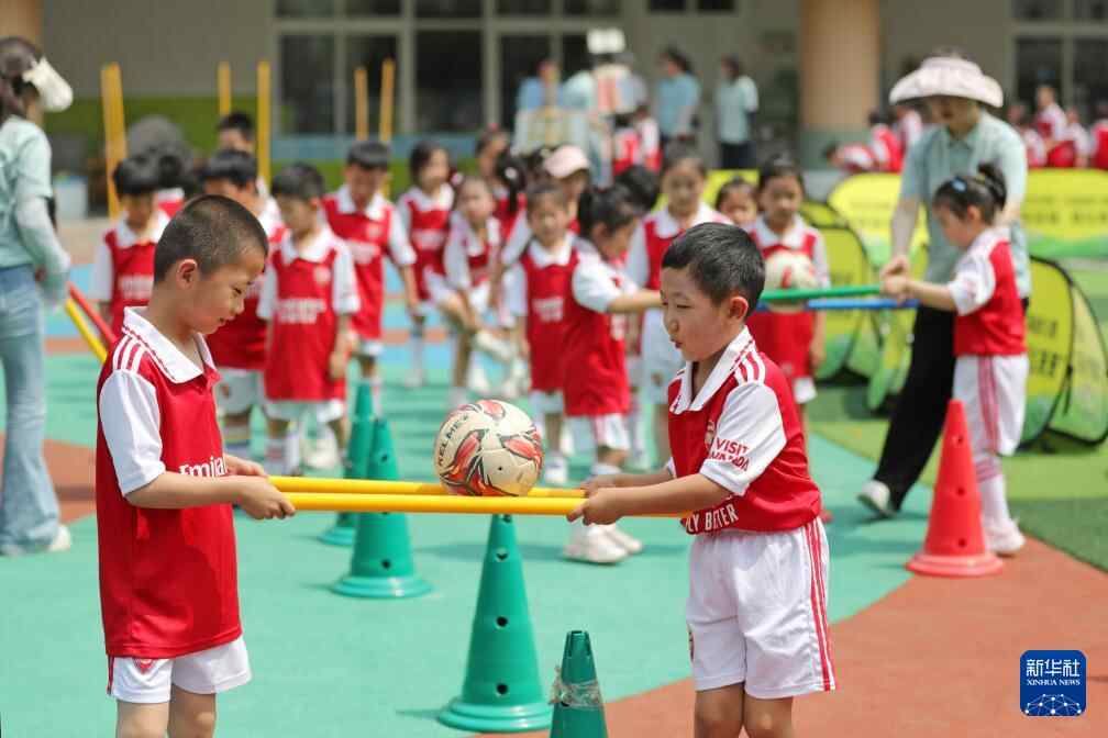 5月29日,安徽省淮北市第二实验幼儿园的小朋友在进行趣味足球游戏。