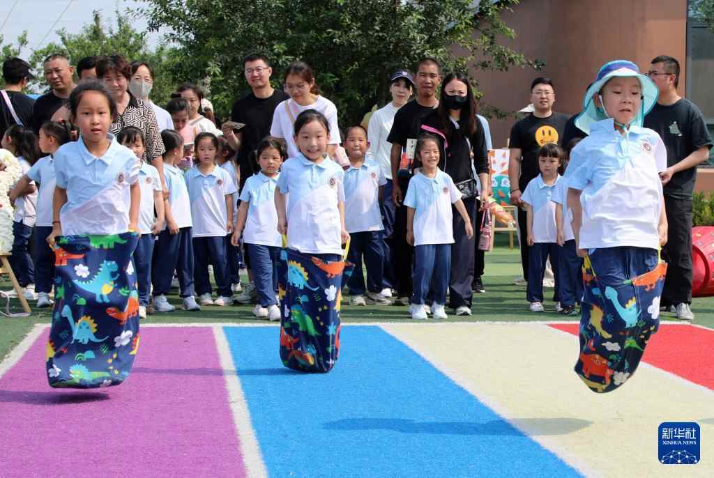 5月29日,在山东省滨州市博兴县金色摇篮幼儿园,小朋友在参加亲子趣味运动会。
