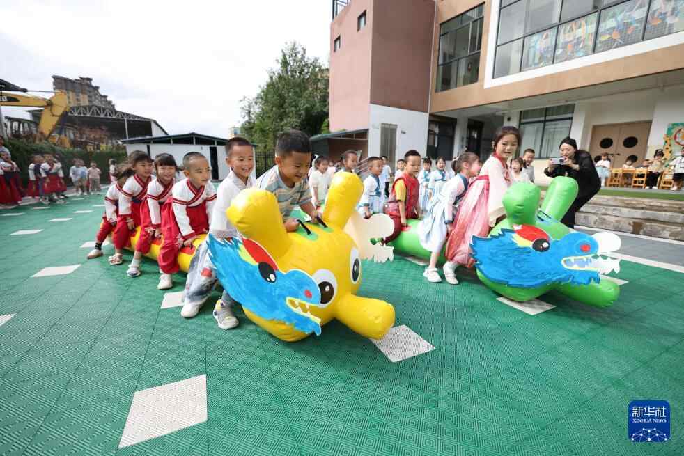 5月29日,在云南省临沧市双江拉祜族佤族布朗族傣族自治县一所幼儿园,孩子们在开展旱地龙舟竞技比赛。