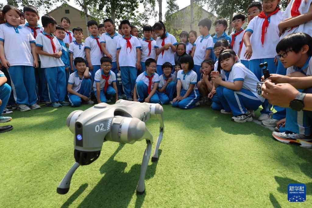 5月29日,河北省石家庄晋州市和平小学举行科普进校园迎“六一”活动上,小学生与智能机器狗互动。