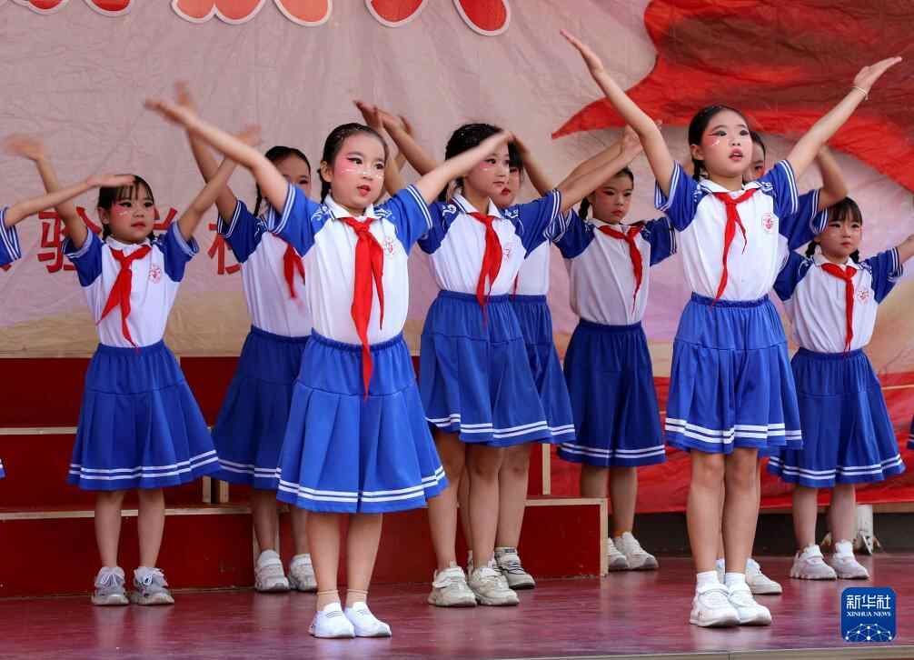 5月28日,在河南省南阳市卧龙区实验学校,小学生在进行表演。