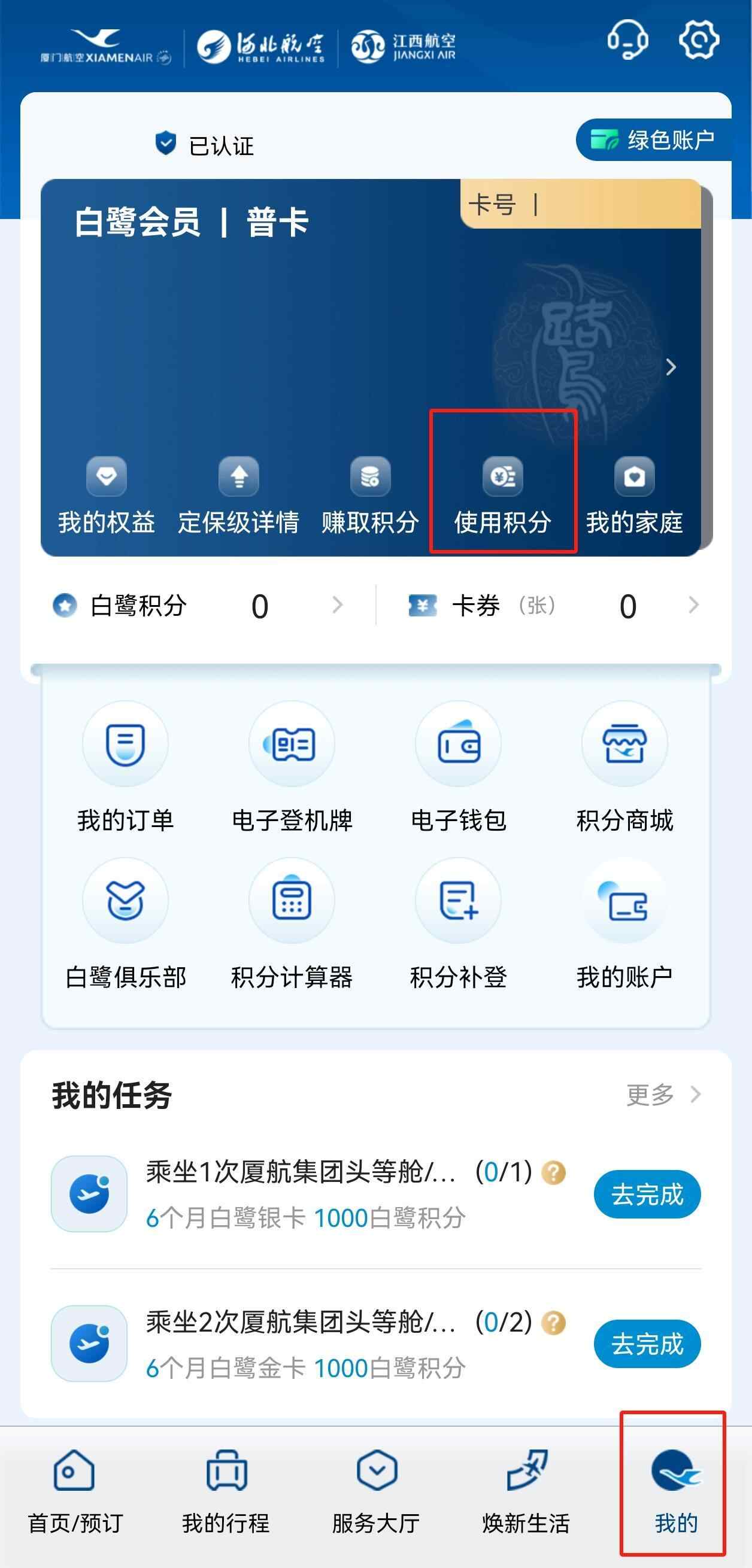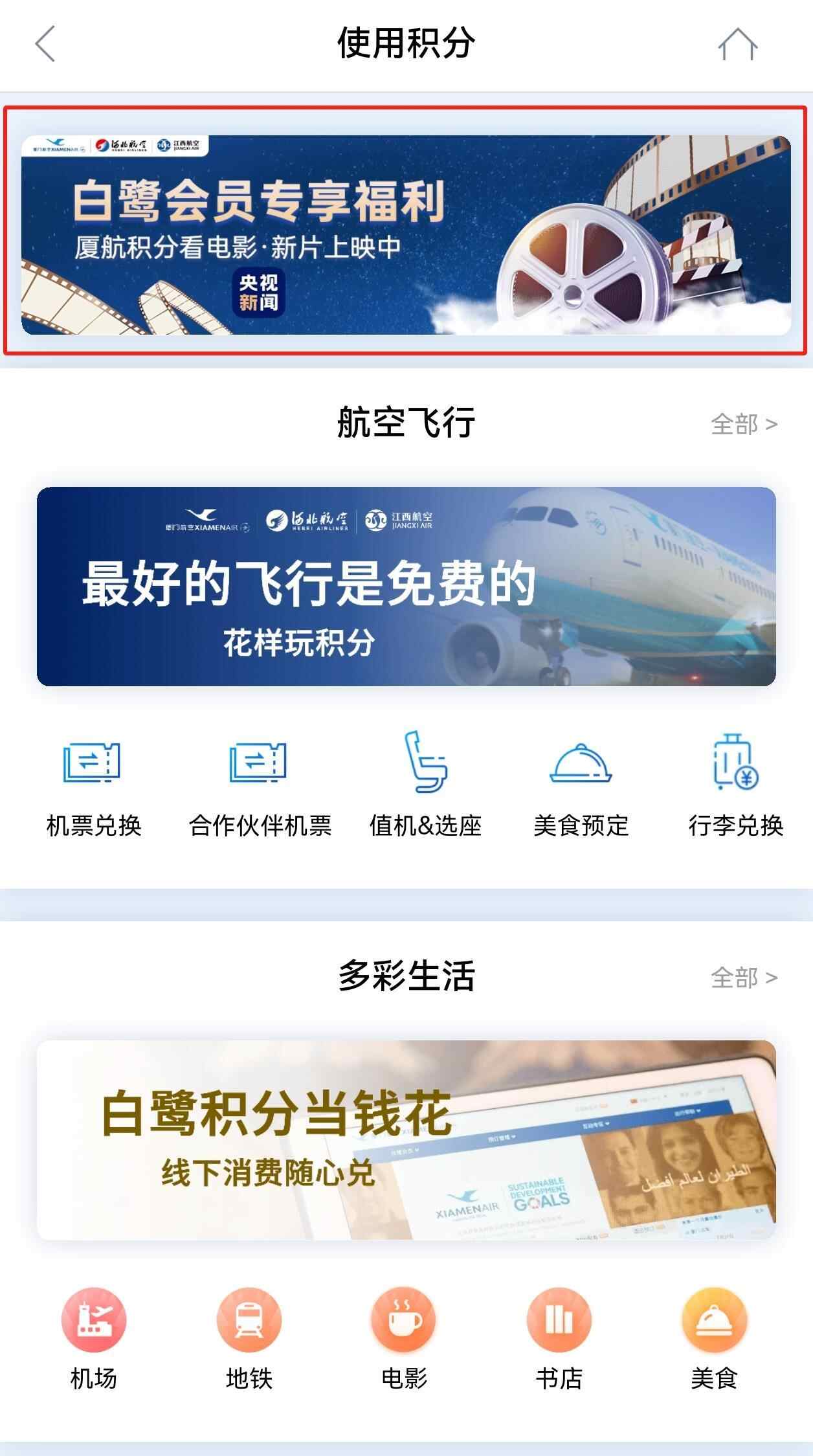 打开厦门航空客户端或“厦门航空”微信小程序,选择底部“我的”页面,点击“使用积分”,进入“厦航积分看电影”专题页,选择心仪影片进行兑换。