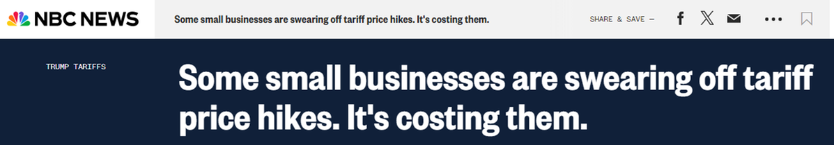 目前,沃尔玛和梅西百货等大型零售商均已表示,由于进口商品成本升高,他们不得不提高价格。大企业的情况尚且如此,中小企业则更加不容乐观。美国全国广播公司新闻网(NBC News)的报道提到,许多美国小企业经营者认为,不断变化的关税对他们的生存构成了威胁。