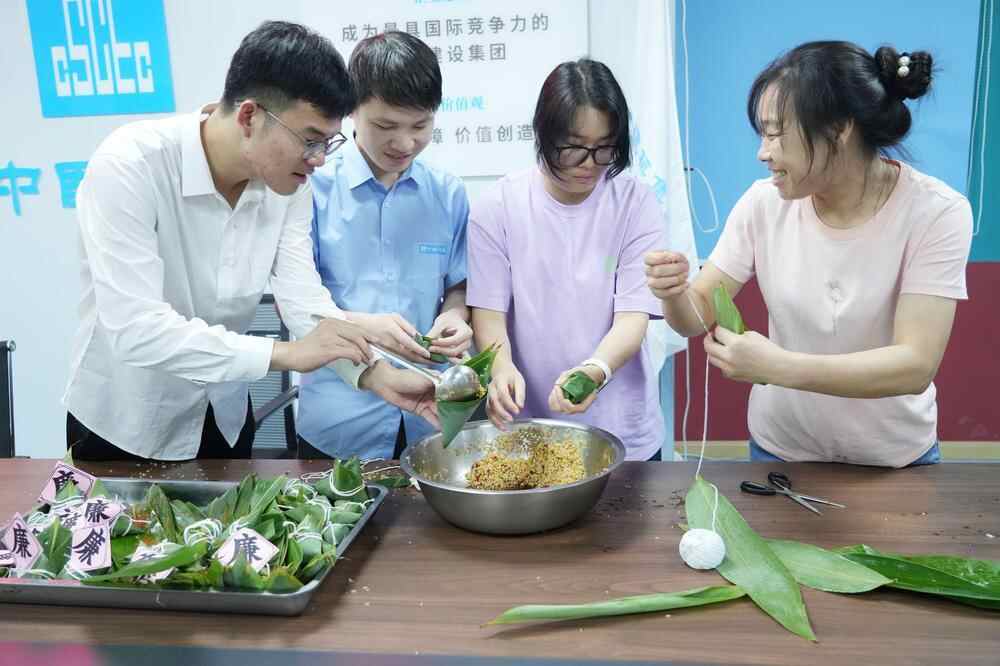 “粽叶光面朝内,折成漏斗状,米粒别装太满……”食堂里,项目管理团队和工人们齐聚一堂,将提前准备好的糯米、五花肉、咸蛋黄、蜜枣等食材填入粽叶,再以棉绳层层缠绕封口,各参与者动作从生疏到娴熟,一枚枚有棱有角的广式粽子逐渐成形。