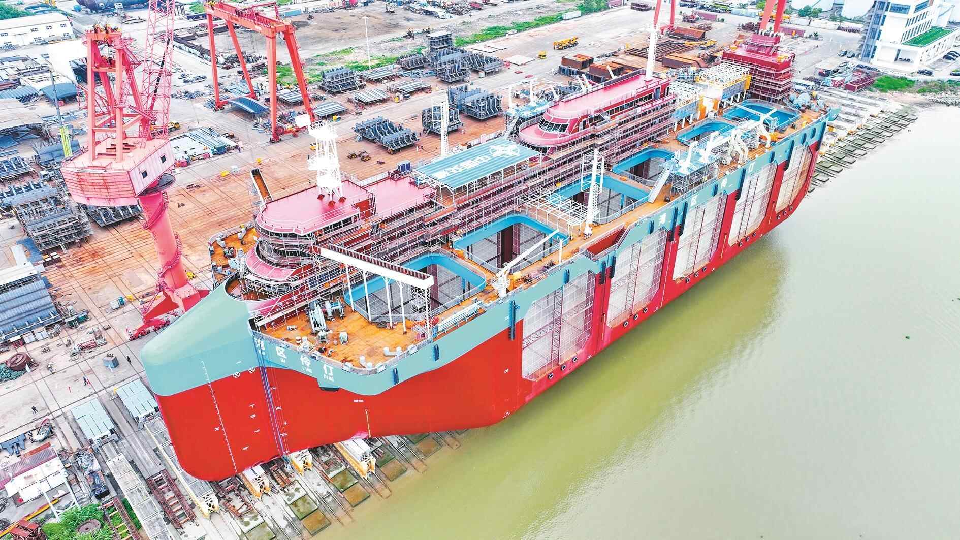 羊城晚报讯 记者陈卓栋、通讯员黄丕康摄影报道:5月27日,记者从中交四航局江门航通船业有限公司(以下简称“中交四航局航通公司”)获悉,中交四航局航通公司建造的全球首艘自航式水体自然交换型养殖工船“湾区伶仃”号在江门下水。记者了解到,该船未来将交付珠海海洋集团用于深海养殖,这意味着广东“海洋牧场”将再添一艘“巨无霸”。