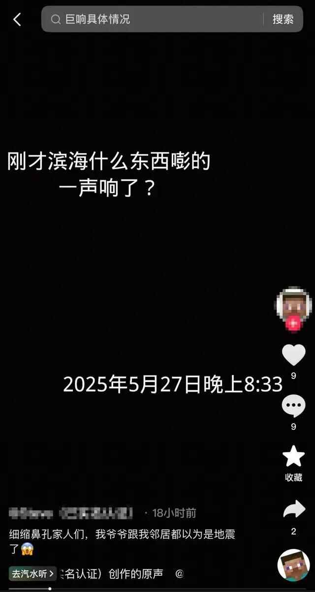 5月27日晚,多名网友反映称,江苏盐城滨海县传出不明巨响。