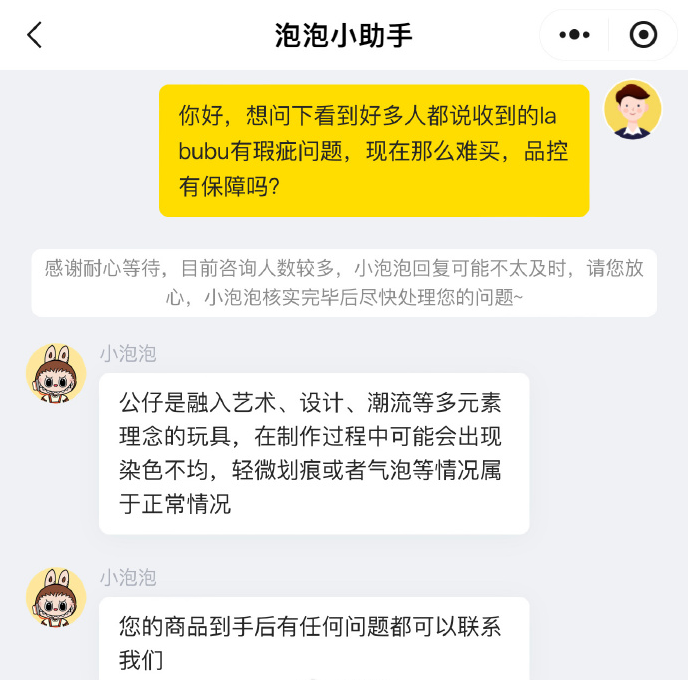 对于出厂产品的品控和质量问题,泡泡玛特客服表示发货的产品都是全新的,出厂前都会有质检,具体以实际收到的货物为准。泡泡玛特在线客服表示,公仔是融入艺术、设计、潮流等多元素理念的玩具,在制作过程中可能会出现染色不均等情况,商品到手后有任何问题都可以联系客服。