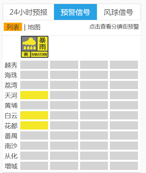 截至29日12时50分,除天河、黄埔发布暴雨橙色预警信号外,白云、花都发布暴雨黄色预警信号。