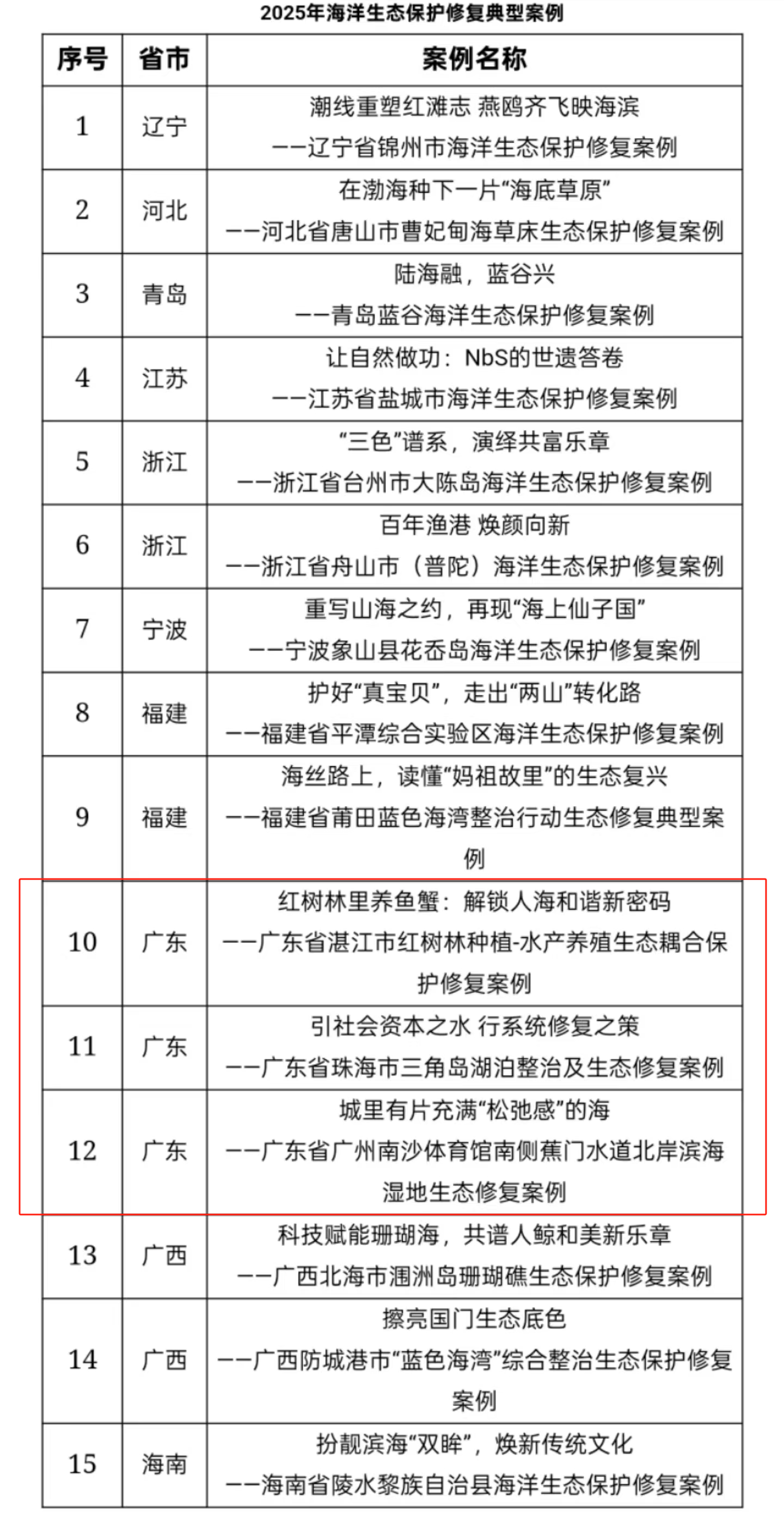 近日,自然资源部对2025年海洋生态保护修复典型案例评选结果进行公示,广东上报的湛江市《红树林里养鱼蟹:解锁人海和谐新密码——广东省湛江市红树林种植-水产养殖生态耦合保护修复案例》、珠海市《引社会资本之水 行系统修复之策——广东省珠海市三角岛湖泊整治及生态修复案例》、广州市《城里有片充满“松弛感”的海——广东省广州南沙体育馆南侧蕉门水道北岸滨海湿地生态修复案例》3案例全部入选。