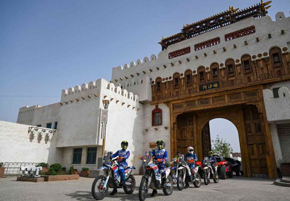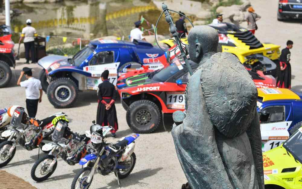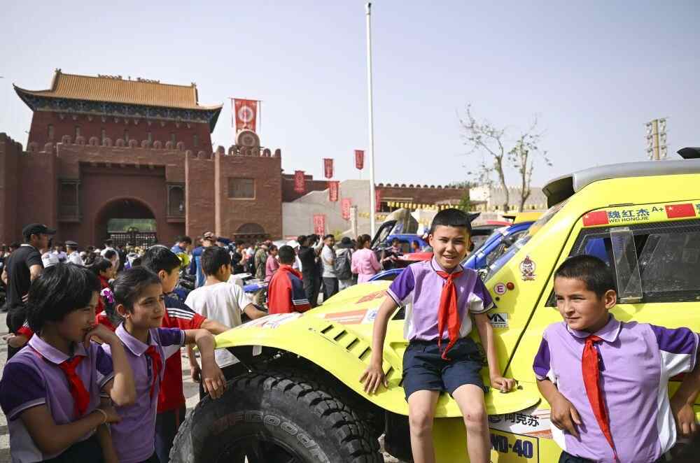 2023年6月1日,2023年环塔拉力赛部分参赛车辆停靠在新疆和田地区约特干故城景区玄奘广场,供游客参观。新华社记者 胡虎虎 摄