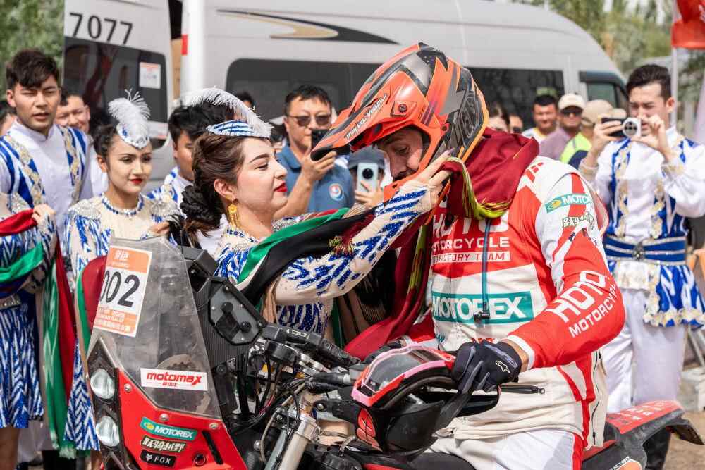 2025年5月24日,在新疆和田地区洛浦县,舞蹈演员为抵达终点的立陶宛车手阿鲁纳斯送上艾德莱斯丝巾。新华社发(环塔组委会供图)