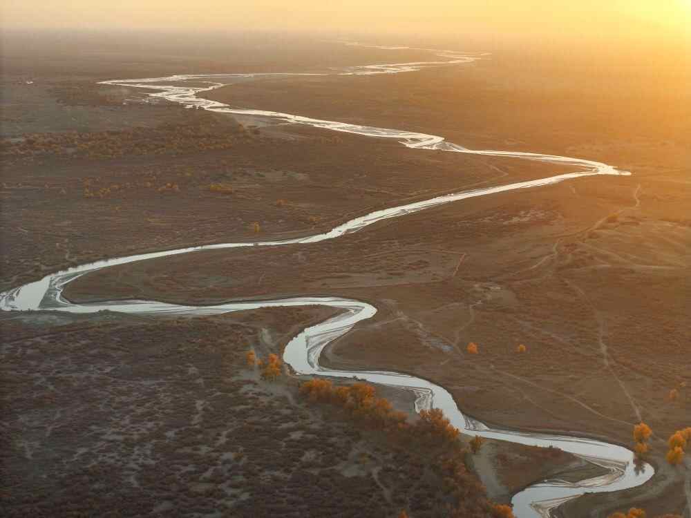 位于新疆和田地区的克里雅河蜿蜒流淌在塔克拉玛干沙漠深处(2024年11月5日摄,无人机照片)。新华社记者 胡虎虎 摄