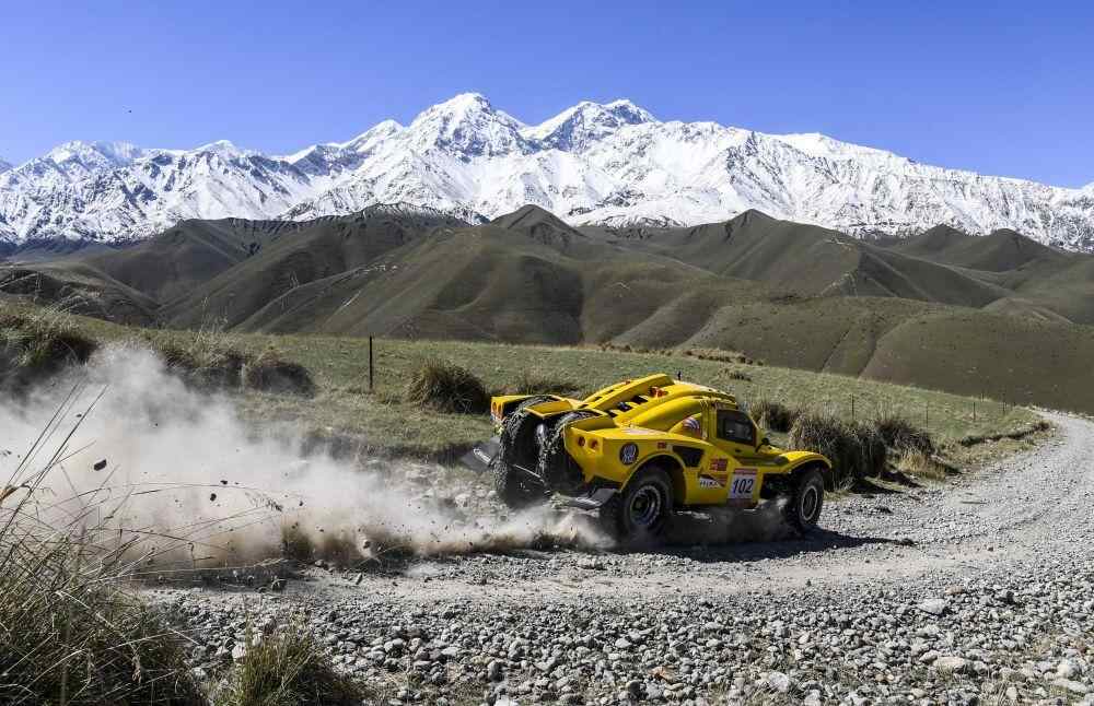 2019年5月31日,在新疆和田地区策勒县昆仑山区,陕西云翔汽摩运动有限公司车队车手訾云刚、领航员王曾嵘驾驶赛车在比赛中过弯。新华社记者 胡虎虎 摄
