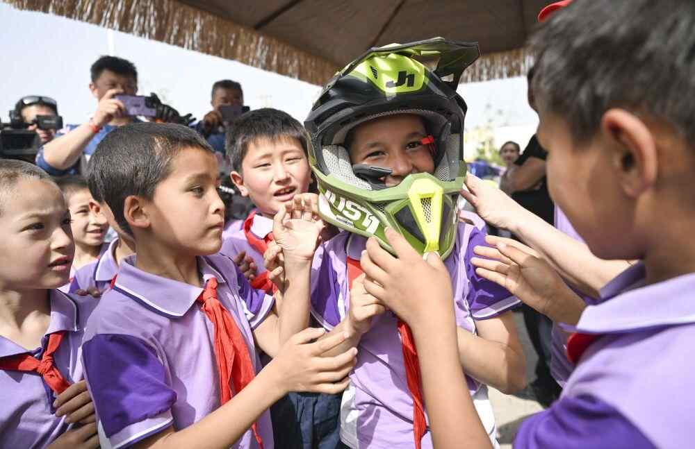 2023年6月1日,新疆和田地区的小学生参加环塔体验活动时,试戴赛手的头盔。新华社记者 胡虎虎 摄