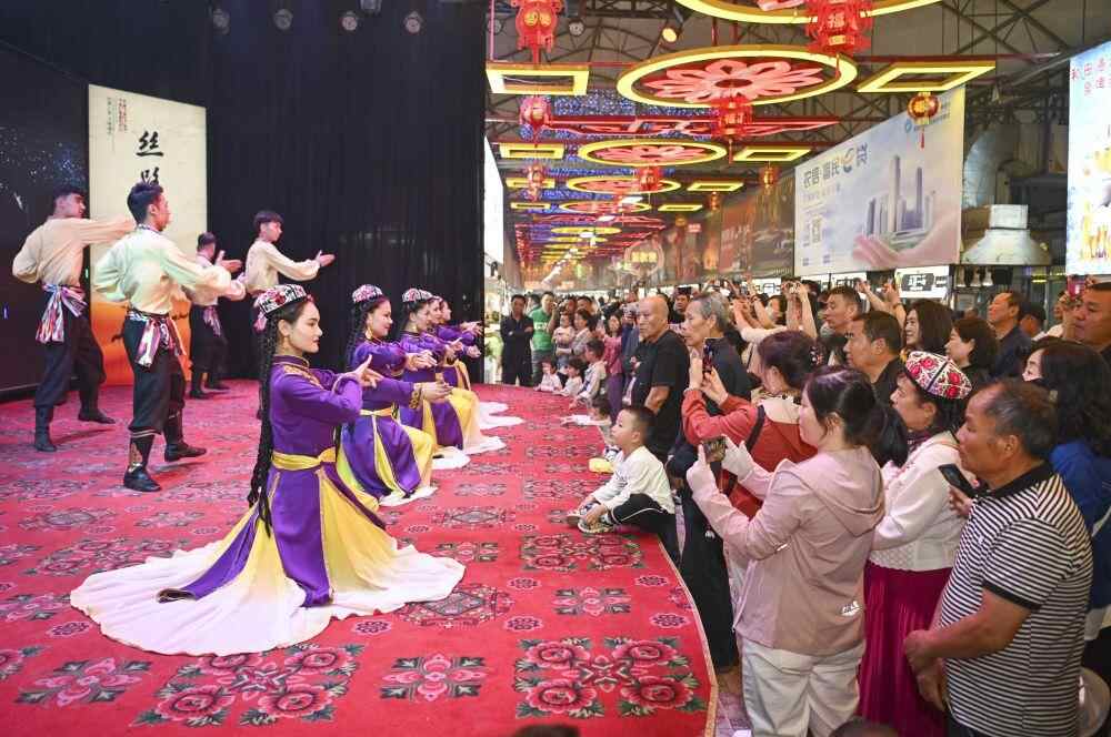 和田市文工团的演员在新疆和田夜市上演出(2025年4月15日摄)。新华社记者 胡虎虎 摄
