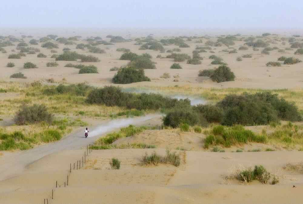 2025年5月26日,摩托车行驶在赛道上(无人机照片)。当日,2025中国环塔国际拉力赛进入第五赛段。该赛段全长280多公里,起点设于和田地区洛浦县,终点位于墨玉县。新华社记者 胡星宇 摄