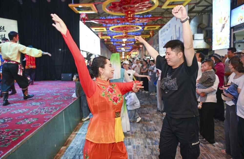 和田市文工团演员努尔比耶·居热艾提(左)在新疆和田夜市上和游客一起跳舞(2025年4月16日摄)。新华社记者 胡虎虎 摄
