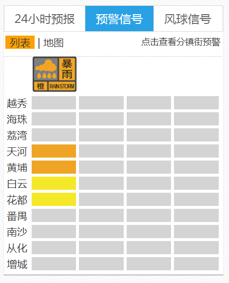 截至29日12时50分,除天河、黄埔发布暴雨橙色预警信号外,白云、花都发布暴雨黄色预警信号。